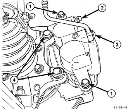 3. Remove two bolts (3) securing disc brake caliper adapter (with brake caliper) (2) to knuckle (4).