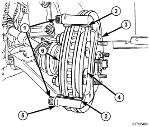 4. Remove disc brake caliper and adapter (2) from knuckle (4) as an assembly. Hang assembly out of way using wire or a bungee cord. Use care not to overextend brake hose when doing this.