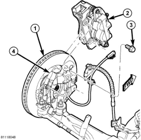 3. Install disc brake caliper and adapter assembly (2) over brake rotor (1).