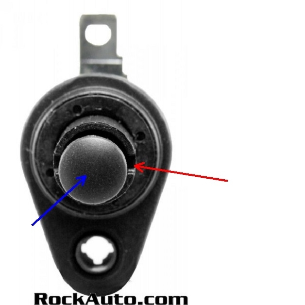 The immediate fix is to pull that nail out about 1/4". The red arrow is pointing to one of two tiny notches where you can insert a pick to pry the nail out. Once you do that, it will self-adjust when you close the door. That will solve the light-staying-on problem, but it is likely to happen again over time. To prevent that, pull that nail all the way out, slide three M5 metric lock washers onto it, then install the nail that way. Those will prevent the nail from over-adjusting. For a professional touch, when I do that repair, I paint the washers with black touch-up paint so the silver doesn't stick out like a sore thumb.