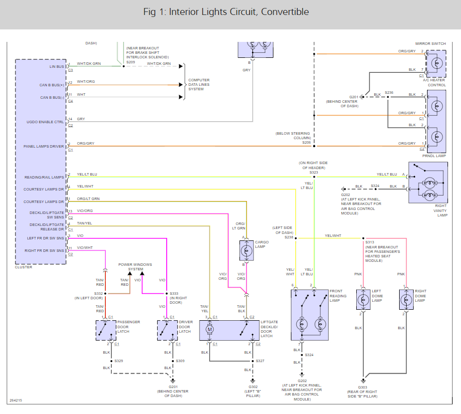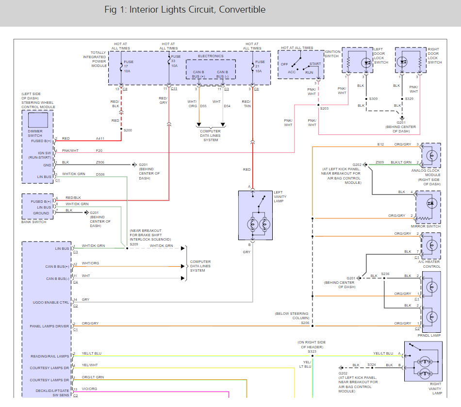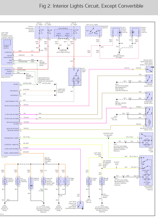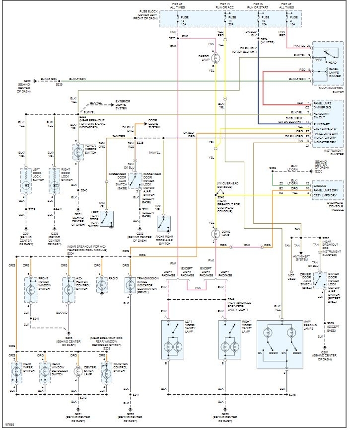 The wiring diagram shows the circuit being grounded to turn the lights on, but there is no way to tell which of the two computer modules does that. There is an "overhead console module" and the instrument cluster.