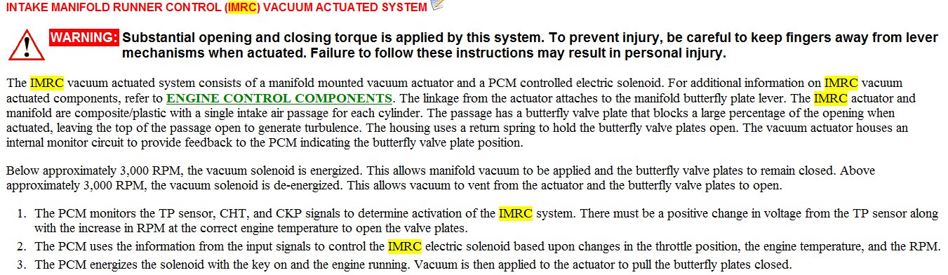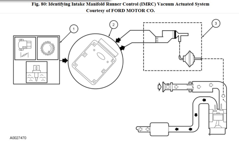 The IMRC is located in a system that is in several pieces that are around the intake manifold. The system is actuated by a linkage that comes off of the Throttle Bpody butterfly actuaction linkage or the thottle itseld. It is a plastic or composite system that has runners going to each system. I am giving you an overview with a description of what it looks like and where it is connected and where it runs to and from. i am also including a diagram of the system as a single cylinder example of what the system looks like if looking at one runner only. It may help you see where it runs to and from to locate it. It is different on so many different models that they do not provide any better diagrams or info any better than this.,
