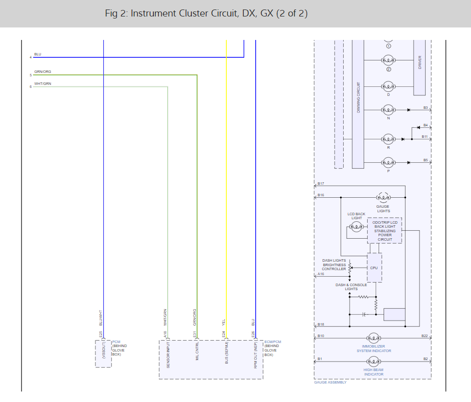 1. Connect the positive lead of a voltmeter to terminal 10 of the under-dash fuse/relay box connector E (YEL) or K (WHT/GRN) and the negative lead to body ground.