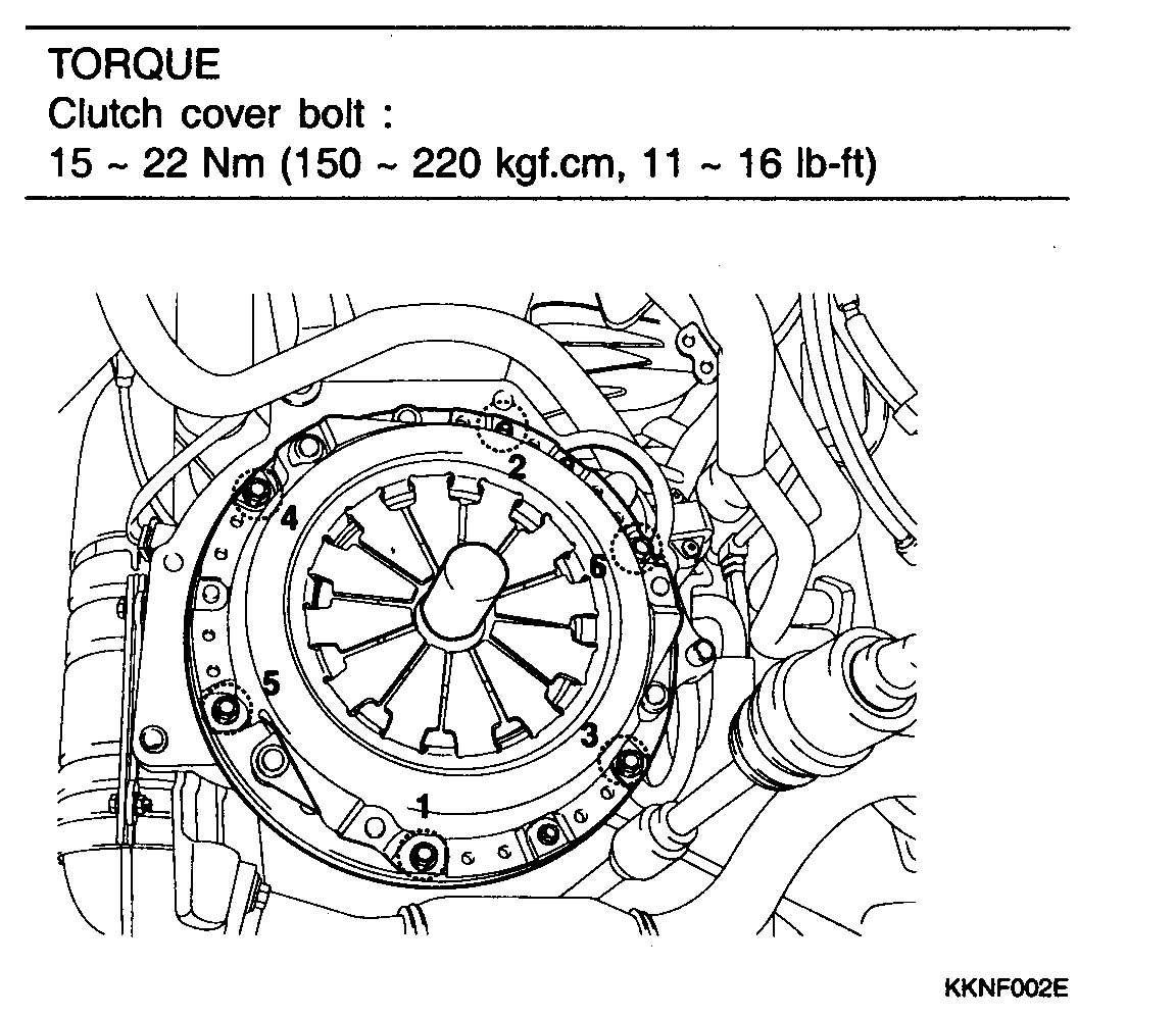 3. Install the clutch cover assembly to the flywheel and temporarily tighten the bolts one or two steps at a time in a star pattern.