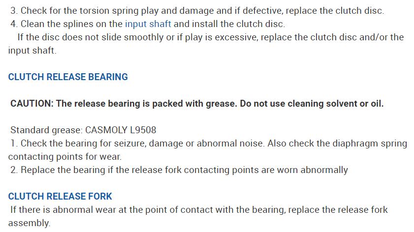 1. Check the bearing for seizure, damage or abnormal noise. Also check the diaphragm spring contacting points for wear.