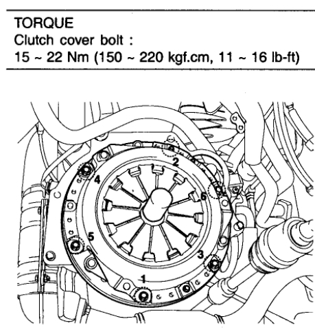 3. Loosen the bolts (Gasoline: 6ea) which attach the clutch cover to the flywheel in a star pattern. Loosen the bolts in succession, one or two turns at a time, to avoid bending the cover.