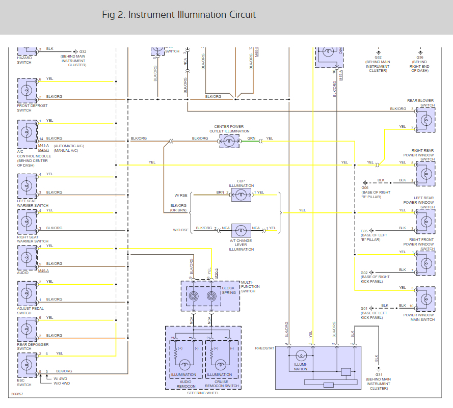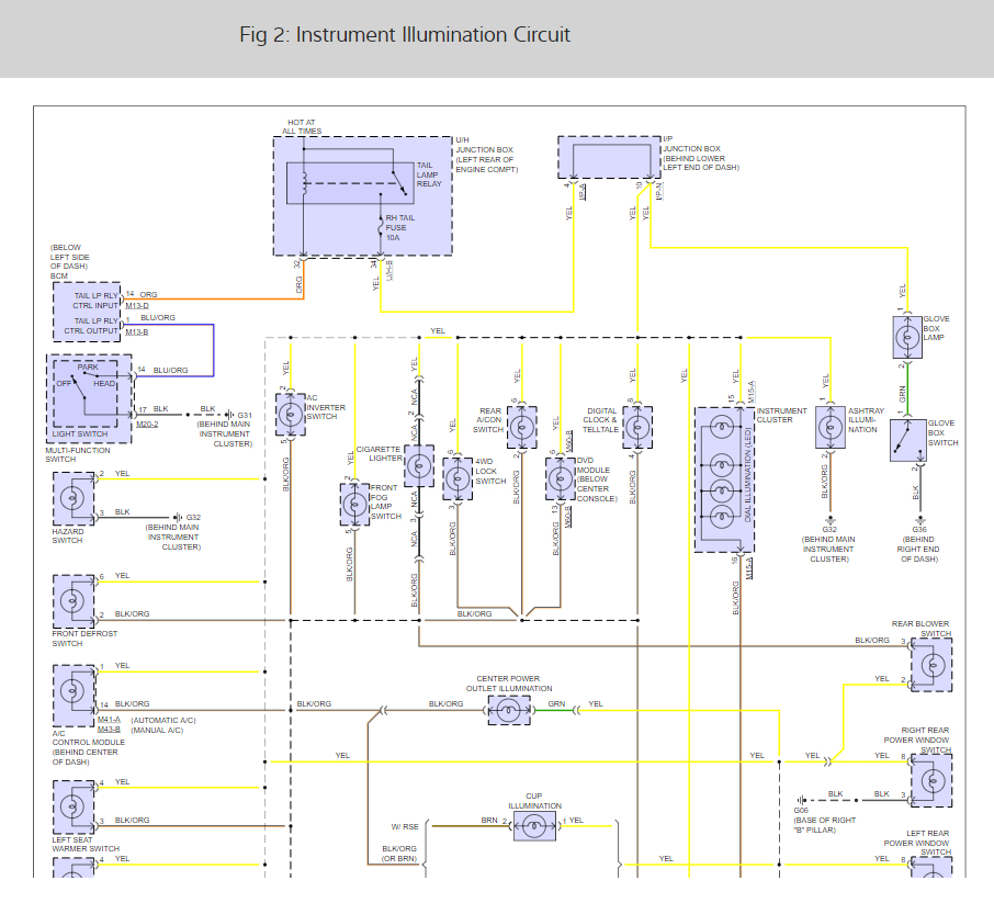 My 2006 Hyundai Santa fe Limited approx 130000 miles. When I turn on the headlights the interior cluster lights wont turn on. I checked the fuses and they are good. I did notice that the radio lights didn't dim down though. The fog lights also won't turn own. I looked at the owner's manual and I notice it doesn't identify the 2 blue relays on the bottom of the fuse box is one of these 2 relays causing my problem.
