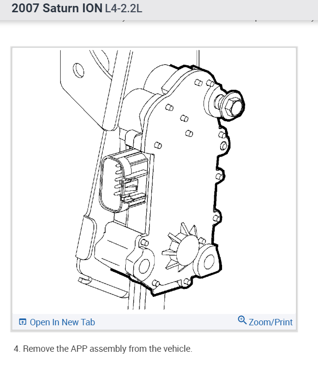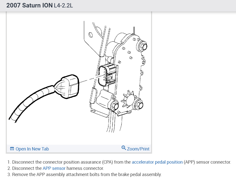 This provides the engine control module (ECM) with a signal voltage proportional to accelerator pedal movement. The APP sensor 1 signal voltage at rest position is near the low reference and increases as the pedal is actuated. The APP sensor 2 signal voltage at rest position is near the 5-Volt reference and decreases as the pedal is actuated.