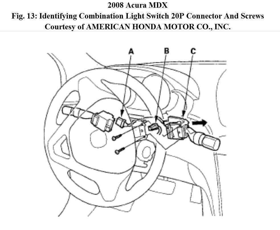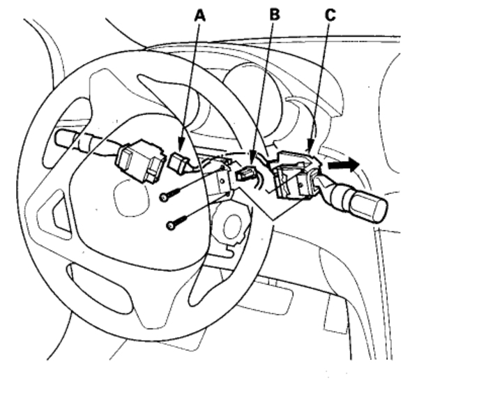 3. Disconnect the combination light switch 20P connector (A), and dashboard wire harness 8P connector (B) from the wiper/washer switch (C).