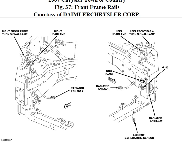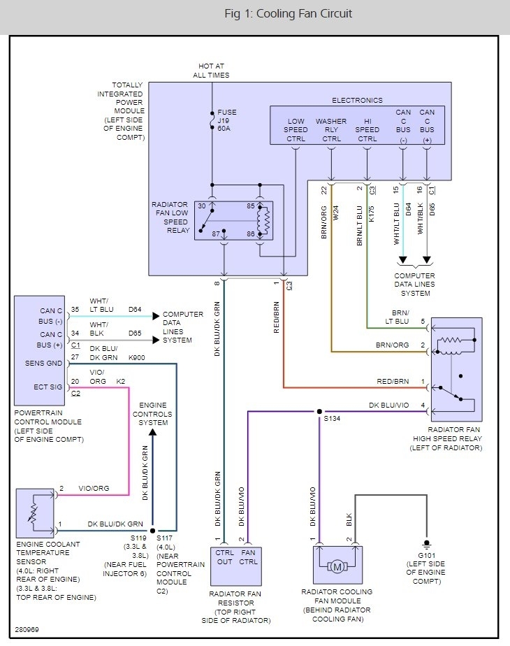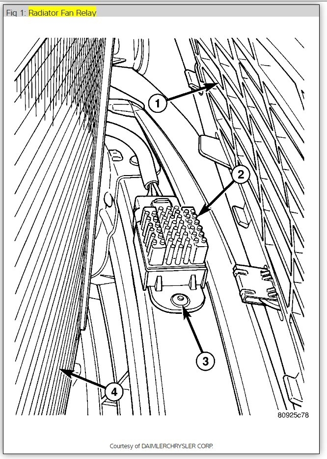 The low-speed radiator fan relay is plugged into the Integrated power module. That is the fuse box under the hood. The high-speed relay is to the left of the radiator. Both of those are controlled by that module. That module is the best suspect if neither relay turns on. To verify that, use a scanner to command the check engine to turn the radiator fan on. If that does not work, switch to the "inputs/outputs" menu for the TIPM, then watch the "fan request" input to the TIPM while you unplug the coolant temperature sensor. If the scanner shows "fan request on", or "high", suspect the TIPM for not responding to the request.