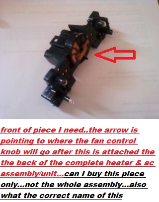 ...Hello...I have a 2008 Nissan Versa...On the heater & AC controls...the center **** which is called the fan control ****. When removing the whole assembly from the dash..on the back of this assembly is where the part I'm inquireing about is located and attached to. The wiring harness is plugged into this inquireing part. I need to replace that part...what would that piece be called (if you understand my explanation) This part I'm needing is removable. I do not need the complete heater & ac control unit/assembly? I'm only needing to replace the part I'm inquireing about.