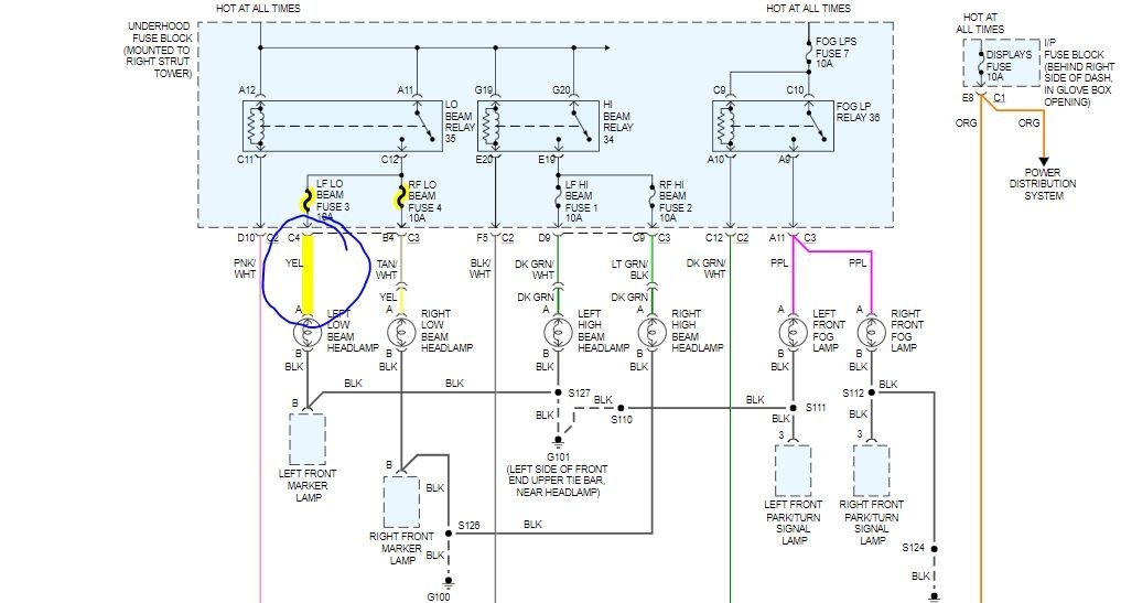Use a voltage tester on the fuse circuit, headlamps on. If no voltage, backtrack the circuit. In the diagram, the yellow wire at headlamp is voltage. Black wire is ground.