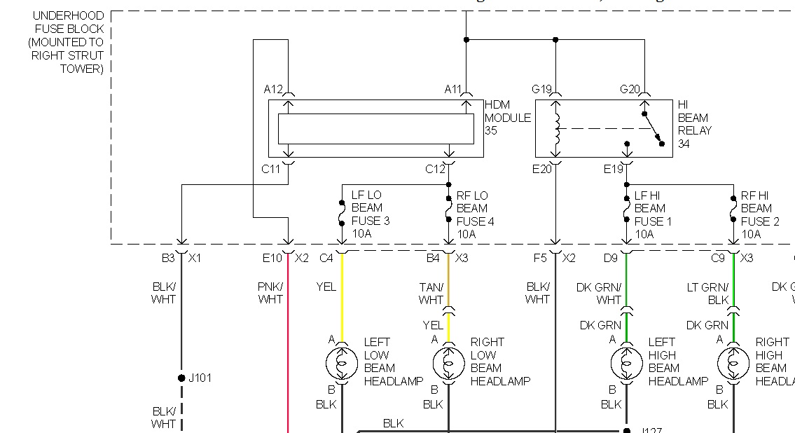 If you find 0 volts on all four test points, the high beam relay isn't being turned on by the Body Computer.