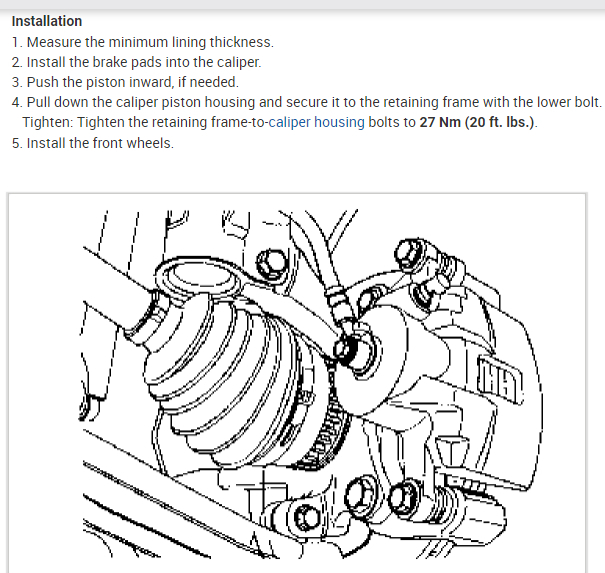 Tighten: Tighten the retaining frame-to-caliper housing bolts to 27 Nm (20 ft. lbs.).