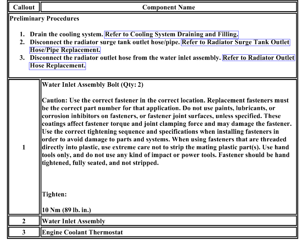A NEW thermostat cover O-ring seal The thermostat The thermostat cover bolts. Tighten the bolts to 89 inch lbs. (10 Nm) The radiator outlet hose to the thermostat cover The radiator outlet hose clamp at the thermostat cover The radiator surge tank outlet hose to the thermostat cover The radiator surge tank outlet hose clamp at the thermostat cover The radiator outlet hose to the thermostat cover The radiator outlet hose clamp at the thermostat cover
