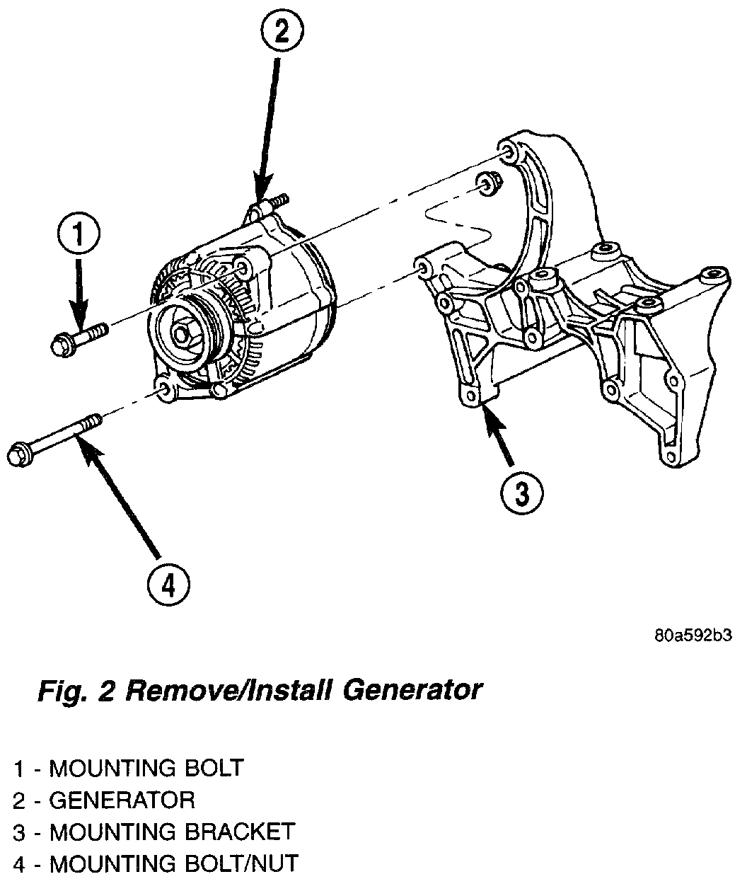 3. In these Engines: Remove generator pivot and mounting bolts/nut (Fig. 2).