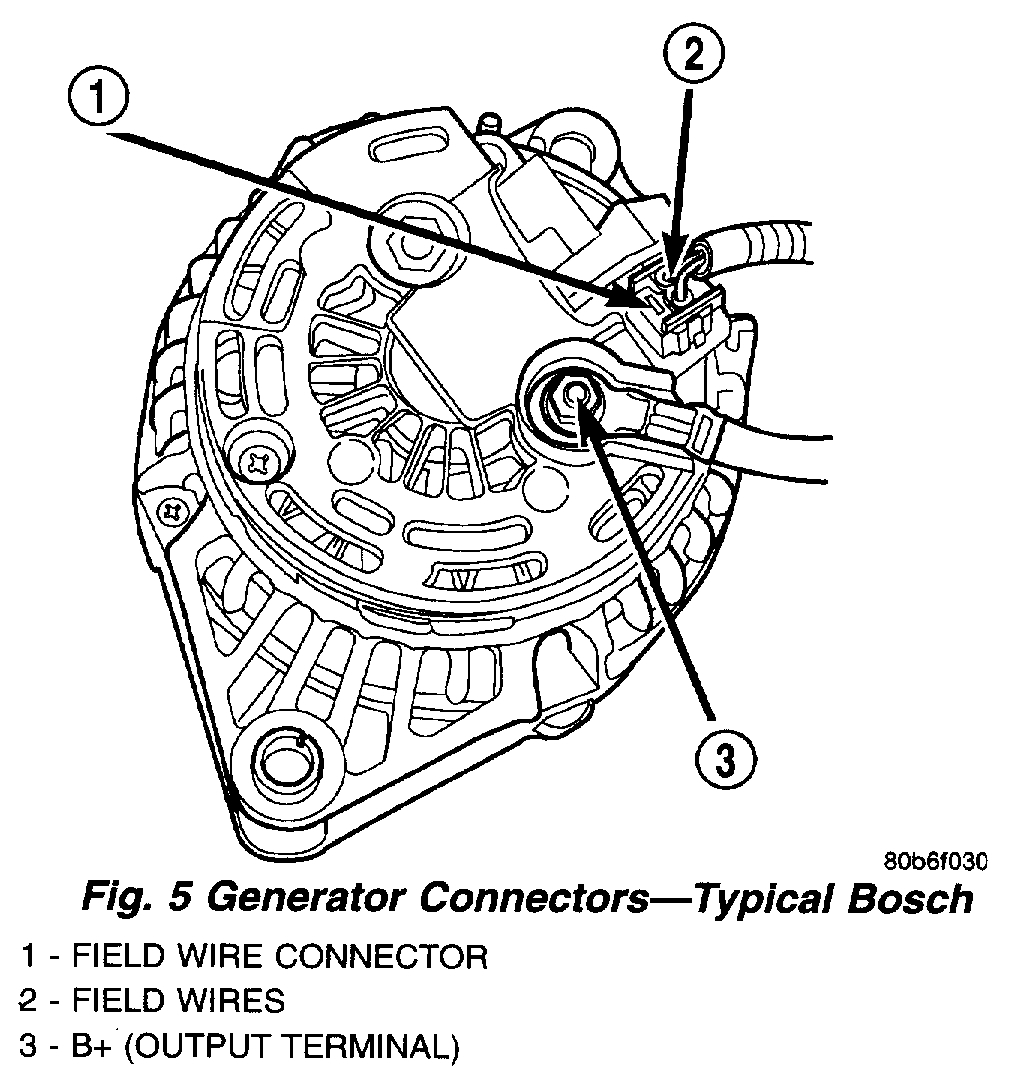 5. Remove B+ terminal mounting nut at rear of generator (Fig. 5) or (Fig. 6). Disconnect terminal from generator.