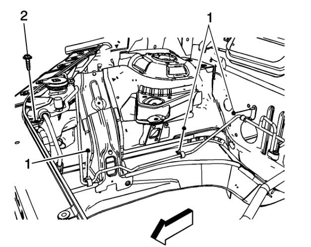 Remove the air conditioning (A/C) liquid line clamp bolt (2) from the upper radiator support.