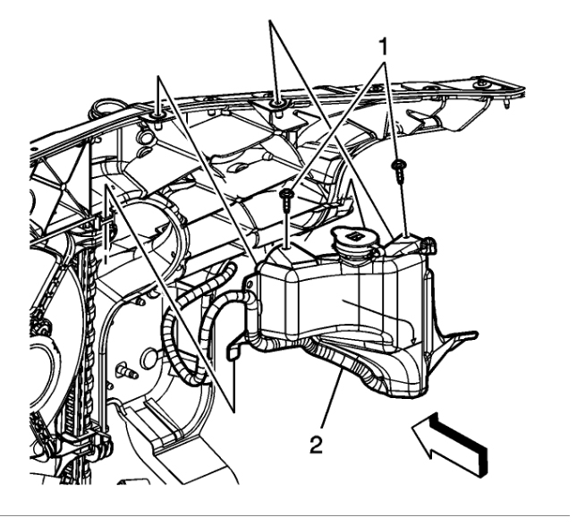 Remove the reservoir (2) tabs from the upper radiator support, position the reservoir out of the way.