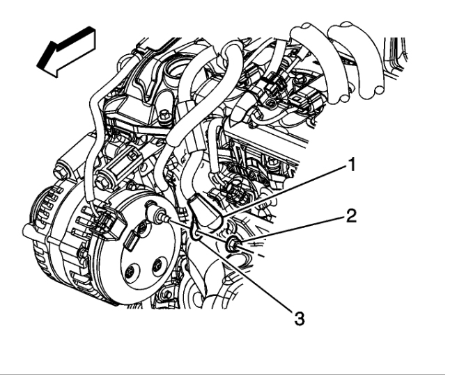 Remove the power steering fluid reservoir hose clip bracket (3) from against the generator.