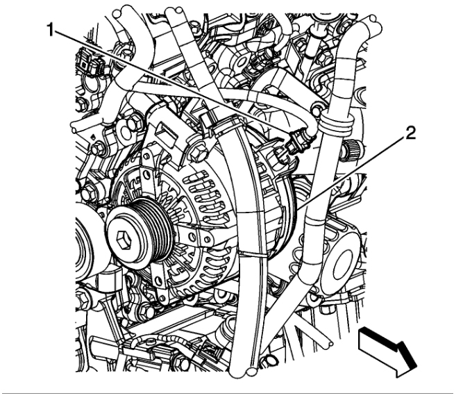 Remove the A/C compressor/evaporator hose bracket (1) from against the generator.