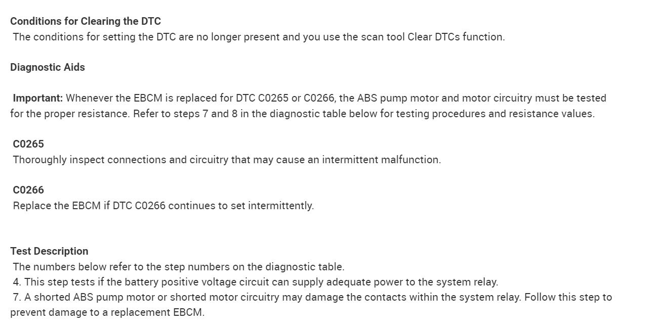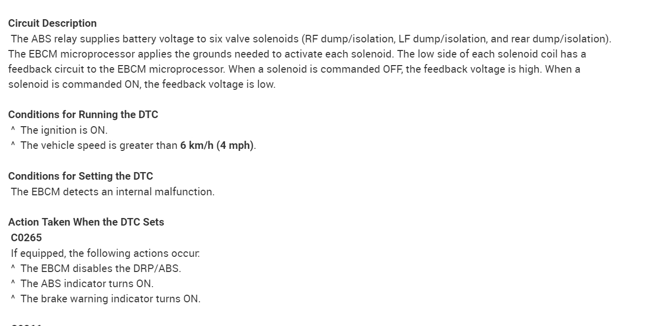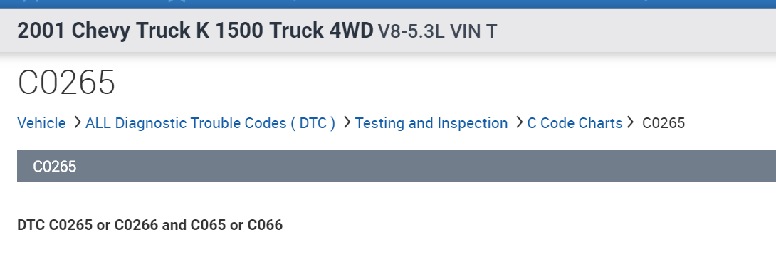 In the diagrams down below I have included the factory diagnostic troubleshooting guide for your vehicle for Direct Trouble Code (DTC) C0265. Please go through this guide and get back to us with what you are able find out for your vehicle's problem.