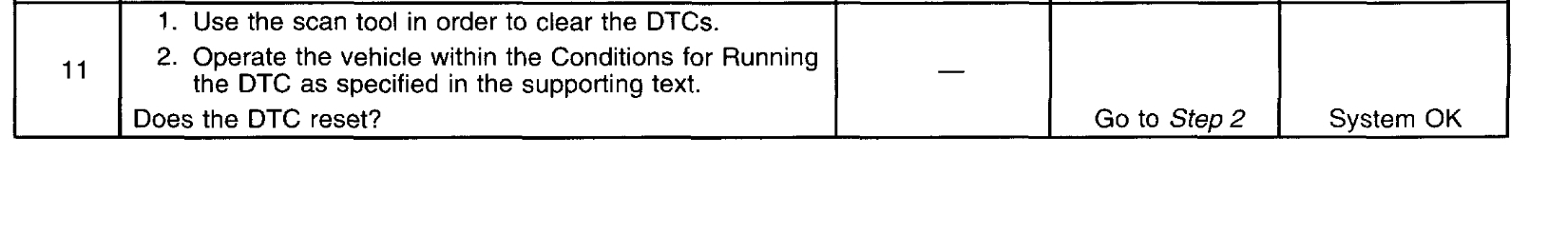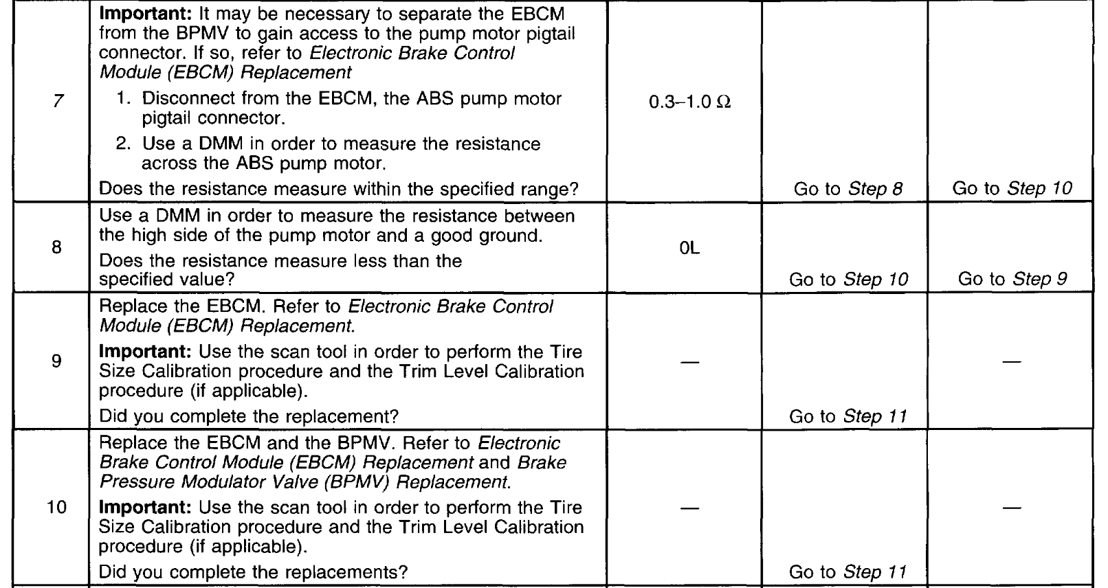 DTC C0221, DTC C0222, DTC C0223, DTC C0224, DTC C0225, DTC C0226, DTC C0227: WHEEL SPEED SENSOR CIRCUIT MALFUNCTION 1. Perform diagnostic system check. See DIAGNOSTIC SYSTEM CHECK under DIAGNOSIS & TESTING. After performing diagnostic system check, go to next step. 2. Install scan tool. Turn ignition on. Drive vehicle at speeds greater than 20 MPH. Recheck DTCs. If DTC resets, go to next step. If DTC does not reset, problem is intermittent. 3. Raise and support vehicle. Disconnect wheel speed sensor harness connector. Using a DVOM, check resistance of wheel speed sensor. If resistance is 700-2000 ohms, go to next step. If resistance is not 700-2000 ohms, go to step 8. 4. Manually spin wheel as fast as possible. Using a DVOM, measure AC voltage generated by sensor as wheel spins. If voltage reading is greater than 100 mV, go to next step. If voltage reading is not greater than 100 mV, go to step 8. 5. Check for poor connections at wheel speed sensor harness connector. Repair as necessary. After repairs, go to step 10. If connections are okay, go to next step. 6. Disconnect wheel speed sensor harness connector. Check circuit for open, short to ground, short to voltage or shorted together. Repair as necessary. After repairs, go to step 10. If circuit is okay, go to next step. 7. Check for poor connections at EBCM harness connector. Repair as necessary. After repairs, go to step 10. If connections are okay, go to step 9. 8. Replace wheel speed sensor. After replacing sensor, go to step 10. 9. Replace EBCM. After replacing EBCM, go to next step. 10. Using scan tool, clear DTCs. Operate vehicle at speeds greater than 20 MPH. Recheck DTCs. If DTC resets, go to step 3. If DTC does not reset, system is okay.