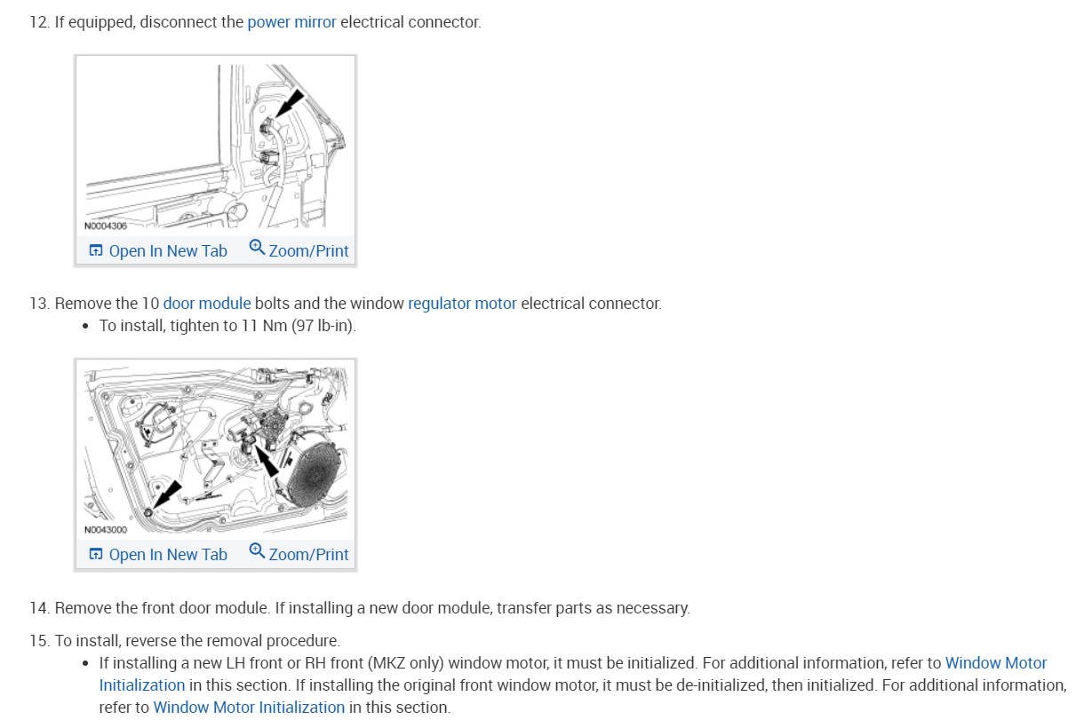 NOTE: A new (original factory setting) or de-initialized LH front or RH front (MKZ only) window motor will not operate in one-touch up mode until initialized. If a new LH or RH (MKZ only) front window motor has been installed, proceed to the initialization procedure.