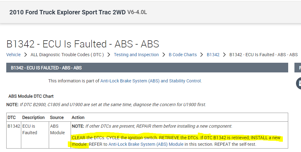 Terry here again with another issue with the wife's Sport Trac..LOL I attached the wrong picture and can't remove it, or don't know how. getting error B1342 and display Check Brake System, says internal ECU error. This call for a new computer??