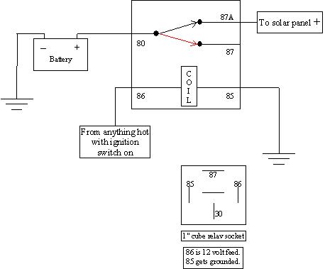 This is the very common 1" cube relay used on many Chrysler and Ford vehicles. Terminal 87A is rarely used. In the diagram, the relay is shown in the at-rest, or turned-off position. Terminals 30 and 87 are making contact. 80 goes to the battery positive post, (or to anything in the fuse box that is always live). 87A goes to the positive wire of the solar cell. Current will flow from the solar cell into terminal 87A, to terminal 80, and to the battery positive terminal.