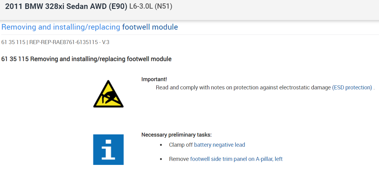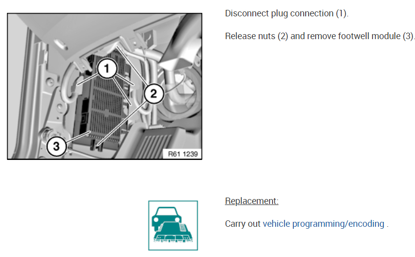 Here is how to swap out the footwell module and the location which I would check the electrical connectors for corrosion which can cause the issue as well.