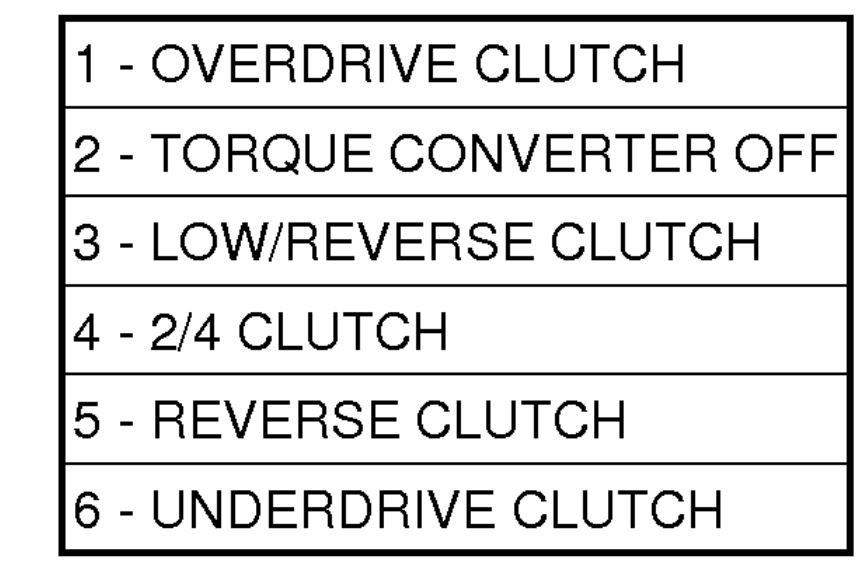 Attach 300 psi Gauge C-3293SP to port(s) (1) overdrive clutch, (2) torque converter off, (3) low/reverse clutch, (4) 2/4 clutch, (5) reverse clutch, (6) underdrive clutch required for test(s) being conducted. Use Adapter Set L-4559 to adapt gauge(s) to transaxle.