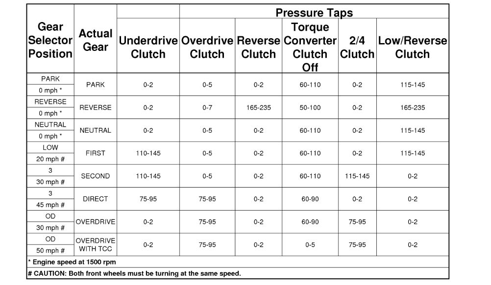 Before performing pressure tests, be certain that fluid level and condition, and shift cable adjustments have been checked and approved. Fluid must be at operating temperature 150 to 200 ° F. (66 to 93 ° C).