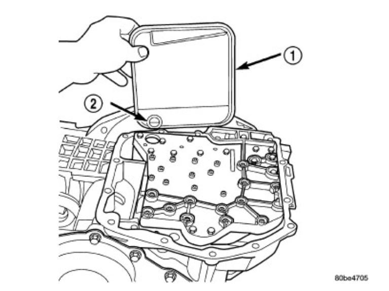NOTE: Only fluids of the type labeled Mopar(R) ATF+4 (Automatic Transmission Fluid) should be used. A filter change should be made at the time of the transmission oil change. The magnet (on the inside of the oil pan) should also be cleaned with a clean, dry cloth.