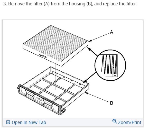 Remove the filter (A) from the housing (B), and replace it. Install the filter in the reverse order of removal. Make sure that there is no air leaking out of the evaporator. https://www.2carpros.com/kpages/auto_repair_manuals_alldata.htm