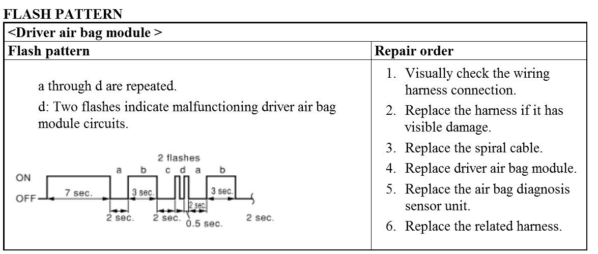 I have 2008 nissan airbag light i have tried to reset. The light blinkes solid for 3sec off for 2, 3 short blinks, then repeats what does it mean. I cant find a page on this. I even took it in to Nissan they reset it and its back.