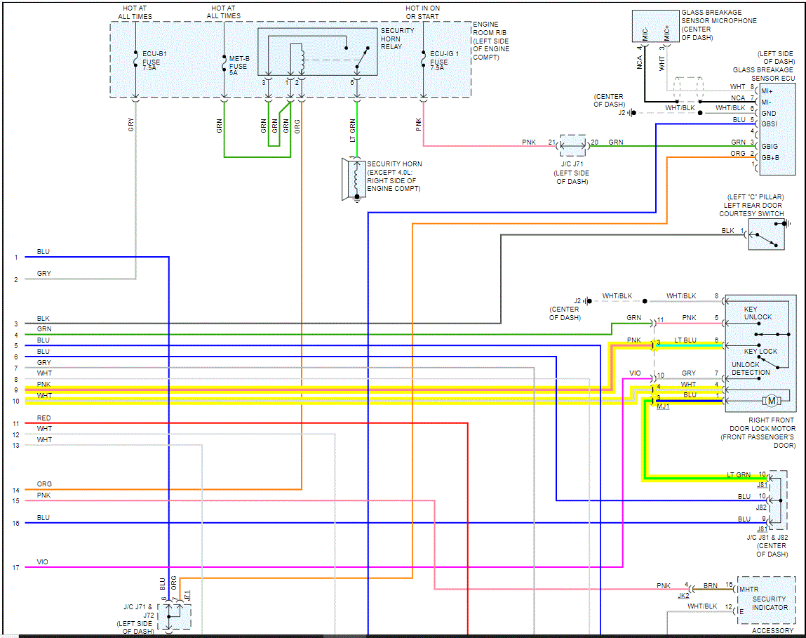 I attached the wiring schematic below related to the door locks. It was 2 pages long, but I had to cut the schematics in half to make them readable for you. I did overlap them so you can follow from one to the next, and I highlighted the wiring for that lock motor.