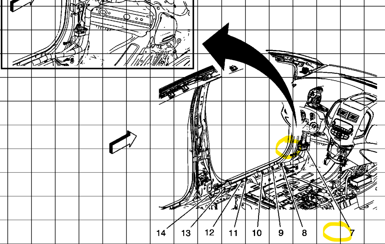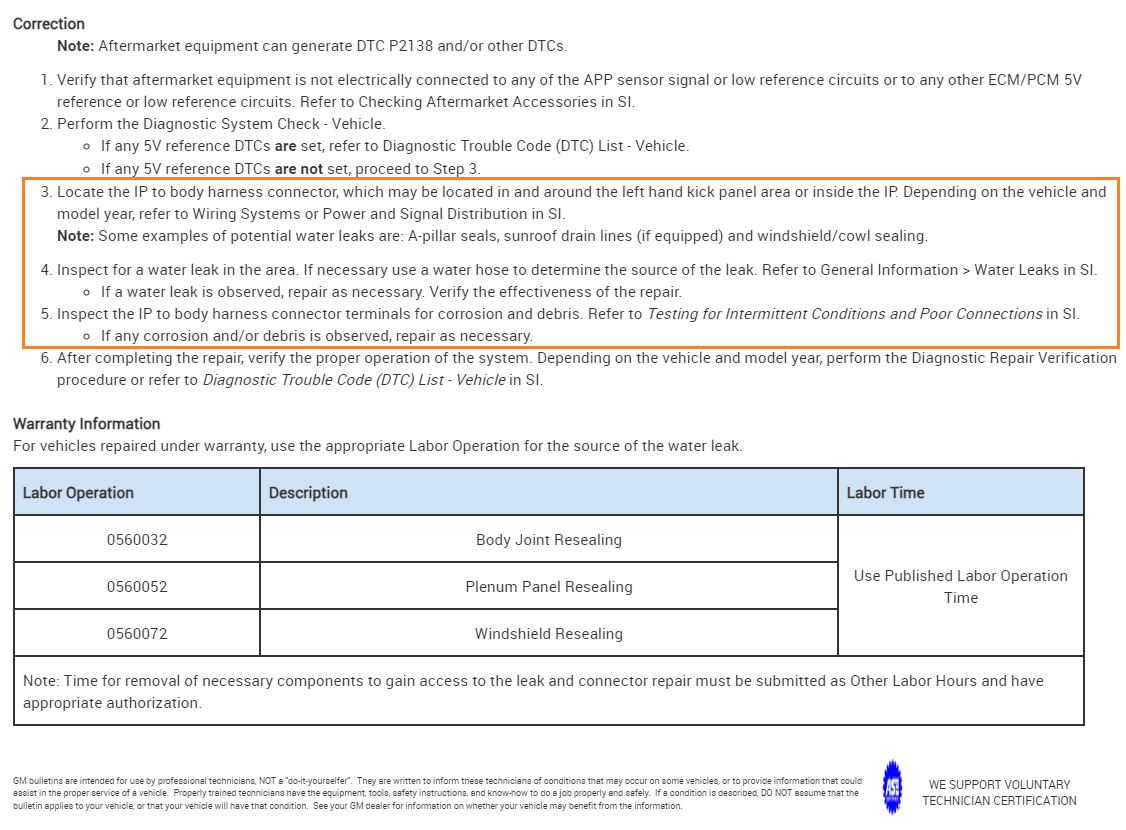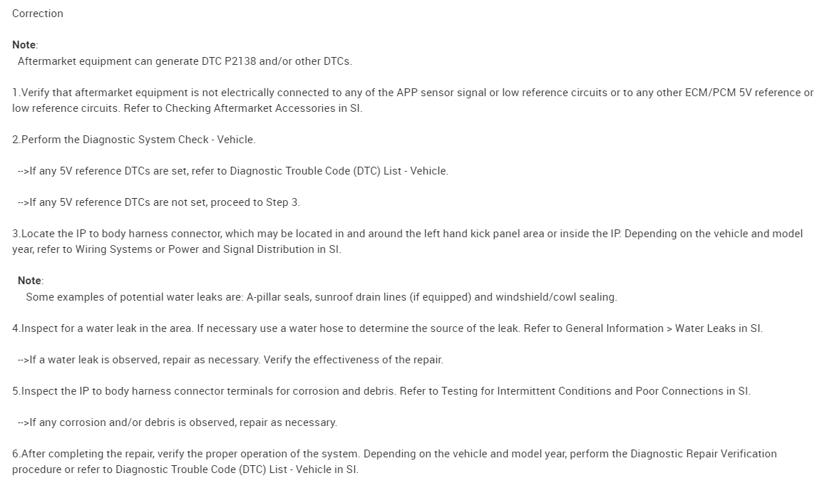 These two TSBs are both related to the same condition, having to do with either water or moisture intrusion into the connector that links the Instrument Panel (IP) to the Body Harness, and there's 2 locations focused on. Diagrams 1-3 are the first TSB and 4,5 are the second TSB, with the 6th diagram being the OEM APP sensor to ECM wiring diagram showing the 2 connectors that are having the issues (X101 and X202). The X202 connector location is the one where I have seen more moisture issues due to door seals, windshield sealing, and other body areas where water intrusion happens. Even just having the driver's window open slightly during rain. But the X202 connector is going to be down by where your left foot would be, behind the kick panel (diagram 7). The corrosion from moisture gets deep inside the connectors and basically grows in there. It can even get up into the wiring insulation which is called wicking. The other connector X101 (diagram 8) is in the front of the vehicle,