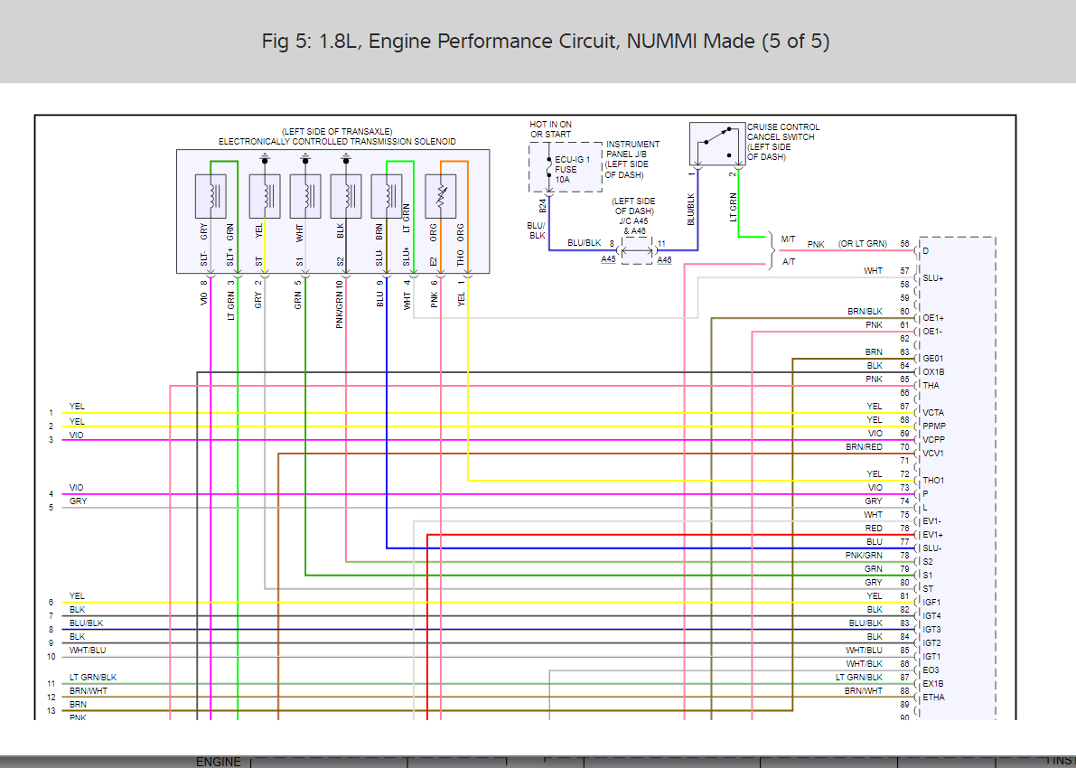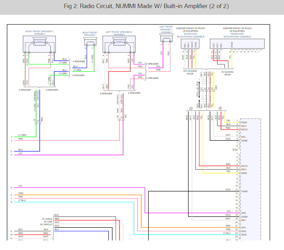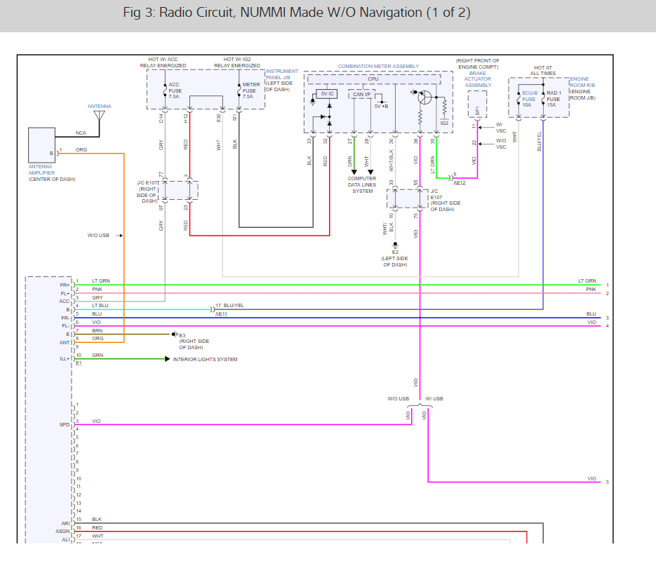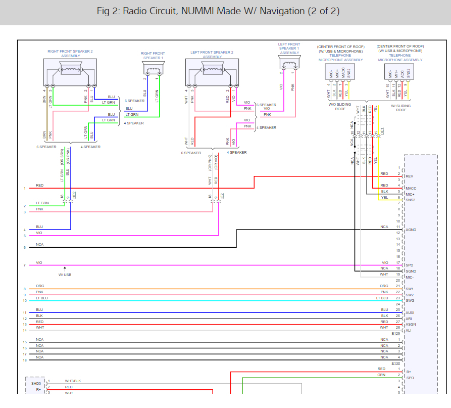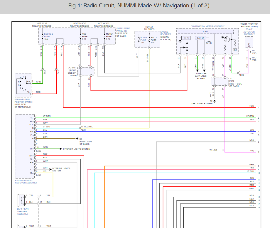I am looking for a wiring diagram for a 2012 Toyota Corolla. More specifically I need the one for the 28 pin connector that plugged into the back of the factory unit. I am looking for the Speed Pickup Sensor wire so I can properly connect my new navigation unit. The stereo came out was a factory non-navi unit model number 86120-02F90.