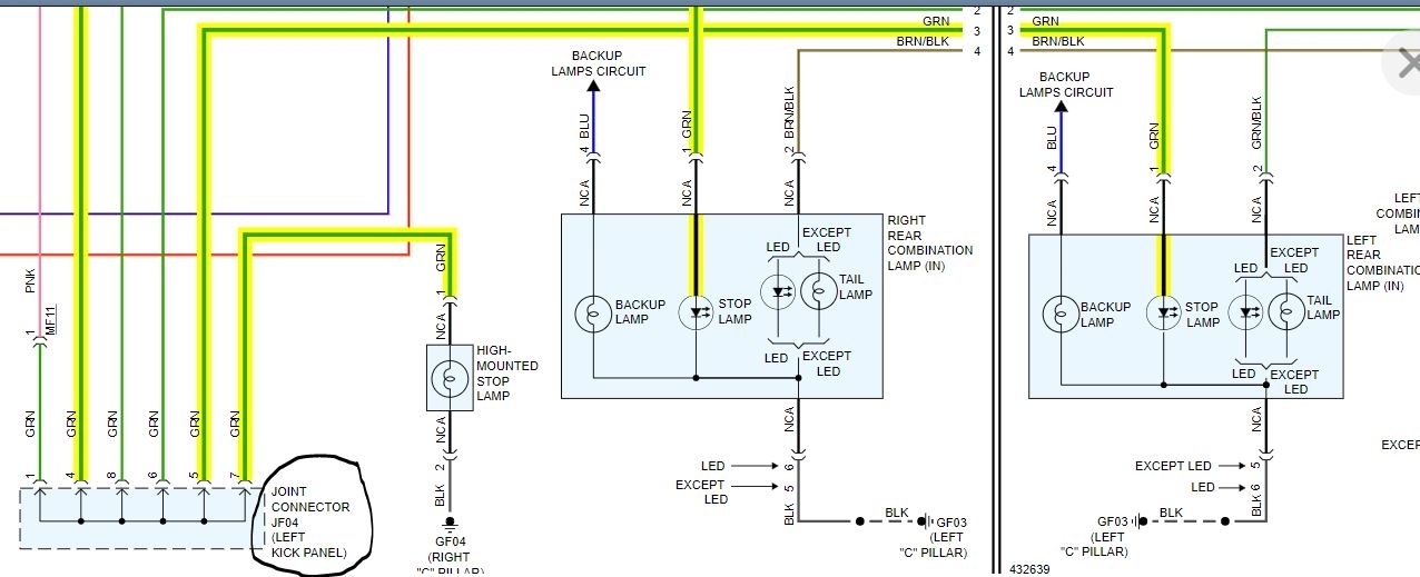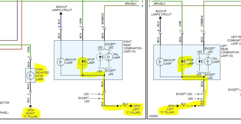 So, the only other thing that I can see that would affect both side lights and not the 3rd is ground location. If ground is lost, but if that was the case, none of the lights would work. If you look at pic 2 it shows that ground for both sides and a different one for the third brake light. If you question that at all, confirm the back up lights work. If they do, the ground should be good.