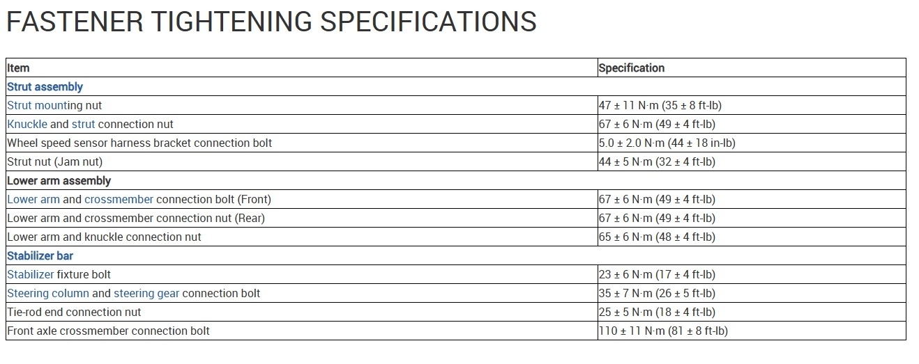 These are the specs for the front suspension. Be sure it is torqued at normal ride height.