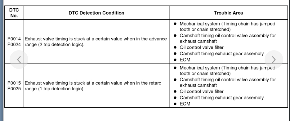 Second, are you doing your oil changes at there recommended interval change and are you using the correct oil 0W20. If you do then I would suspect bad oil control valves. P0014 Bank1 sensor "B" would be the oil control valve on driver side on the exhaust side. See first image.