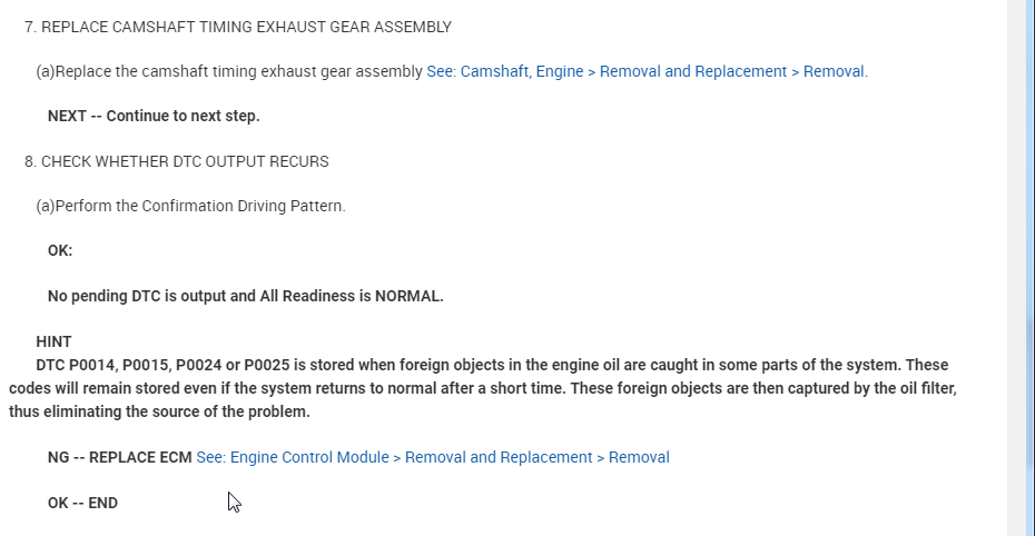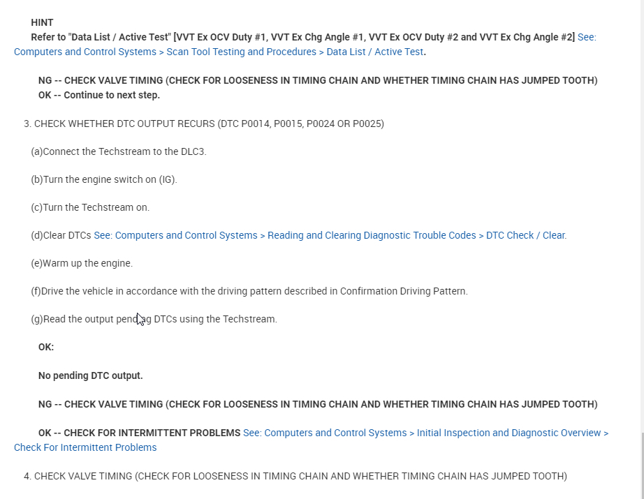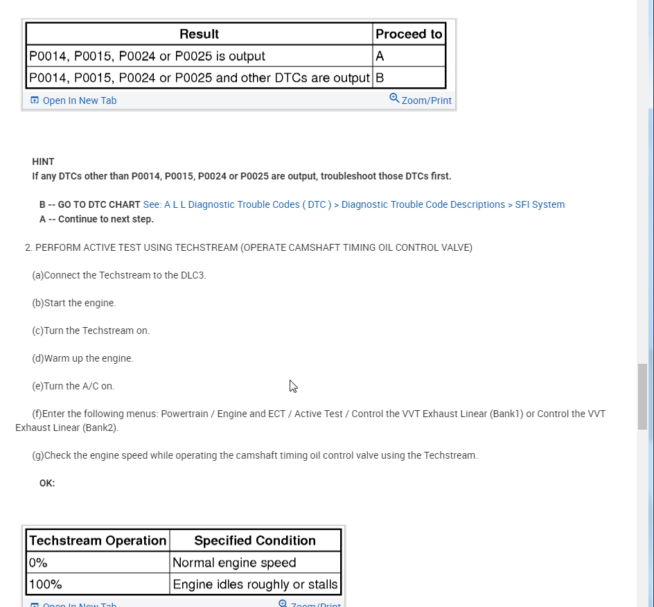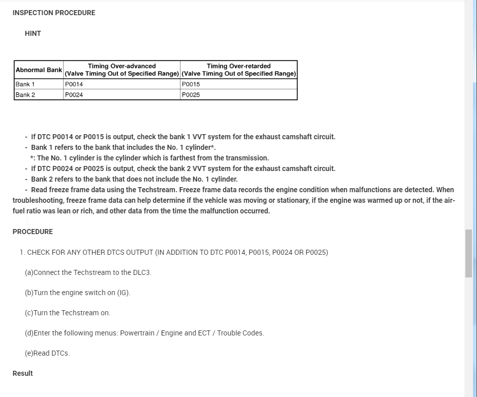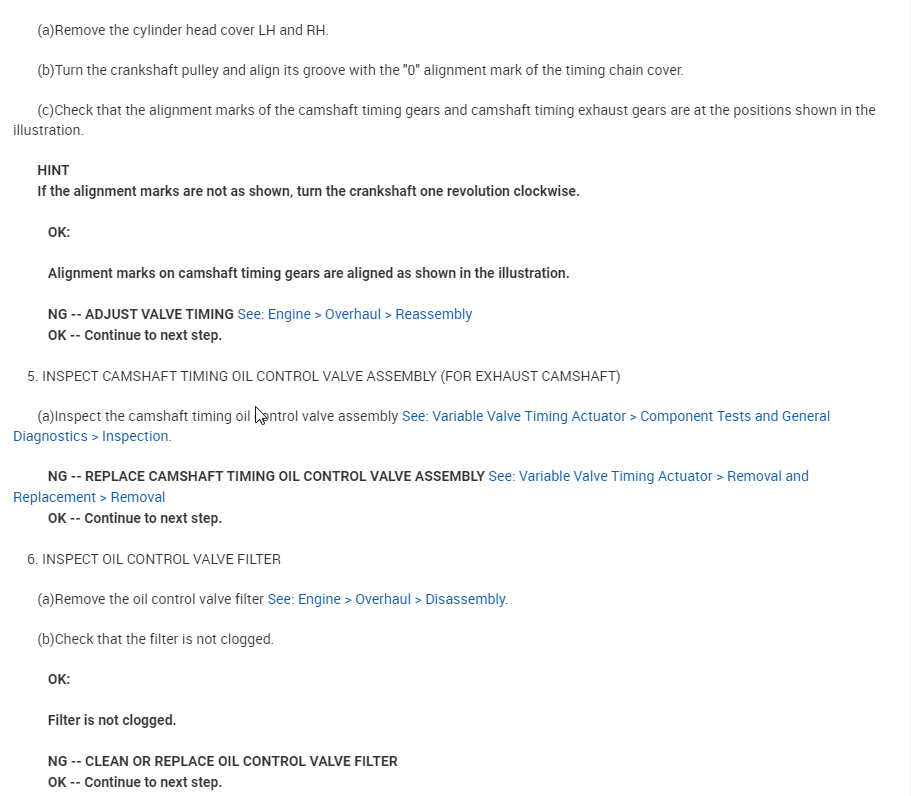If the result is not as specified, check the oil control valve, wiring and camshaft timing gear.