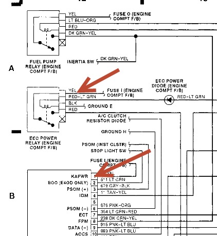 check fuse 1 in engine compt and eec relay pic enclosed. kawpr is pin 1 on pcm. If you dont' know where that is have a pro do this as it sounds like you really need more h elp than we can give.