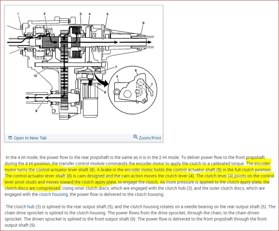 Okay. If you hear the clicking but it is not engaging the front wheels, this could still be the actuator or it is potentially the clutches not fulling engaging. If you look at the first attachment from my last post, you will see the power flow when in 4HI. The only thing different from 2WD to 4HI is the clutch lever applies the clutches which directs power through the case to the front. No gear reduction is happening so it appears it is in the engagement system or the clutches themselves.