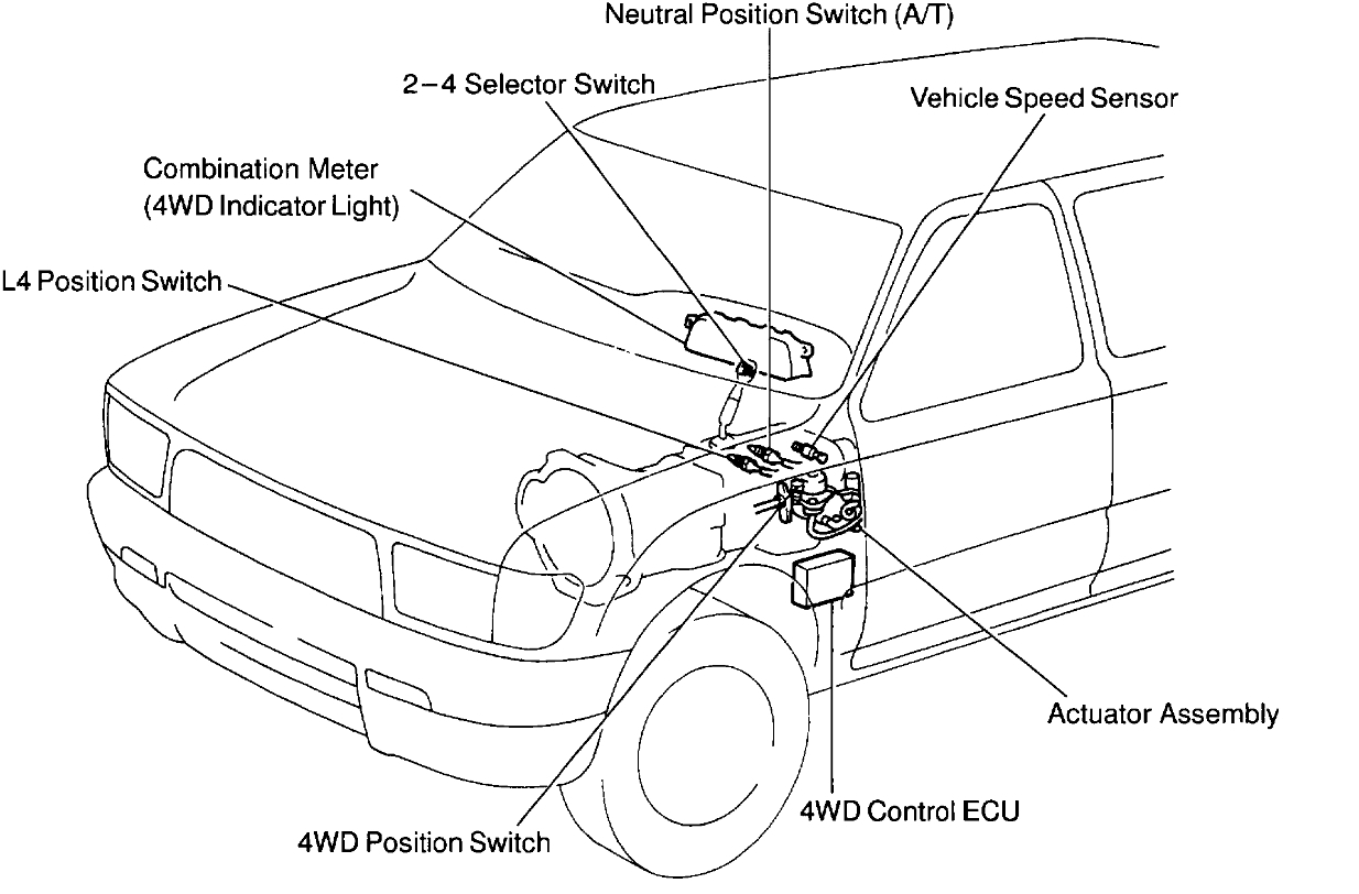 The 4WD ECU operates the 2-4 select motor in accordance with the conditions of the 2-4 select SW, detection SW (Transfer 4WD position) and detection SW (Transfer L4 position).