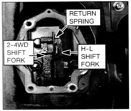 If you notice in the picture there is a spring that pushes the shifter over into the 2/4 shift fork. If it is broken it can cause this. The shift lug itself could be broken as well. The lug is pinned to the shifter, If it has broken it may be possible to remove the pin and replace the lug without completely disassembling the case, but I have never tried it and the rebuild information in the book says nothing about it, just that you need to pull the case apart for access.
