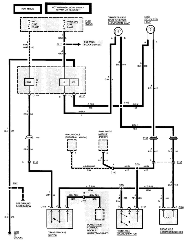 New process transfer case in it it has a 4l80e transmission. I have looked everywhere for wiring diagram for the four-wheel drive cymatics transportation everything that has to do with the four-wheel drive wiring. I have power at the blue wire at the phone actually accumulator when the four-wheel drive shifter is 4 wheel drive range. it has a transfer case out of a 1994 Silverado half ton so the transfer case sensor is a three wire sensor in a wire sensor that came out of it was only a two wire what is hooked up to blue in the brown I have no power to Brown that's accumulator it's a front axle.