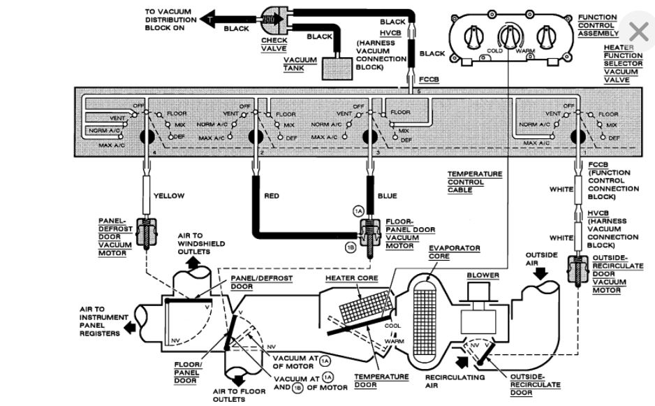 As in the subject line, i have the car listed above with a v4 Foxbody hatchback, i just purchased. A/C runs ice cold to the floor boards and the defrost vent when on max A/C setting and has some blockage somewhere in the line that is preventing it from coming out of my vents. Looking everywhere for a diagram for the vacuum lines for the A/C ab everything is coming up dry for me. Could you help me out with a step-by-step or how i can go about repairing this issue?