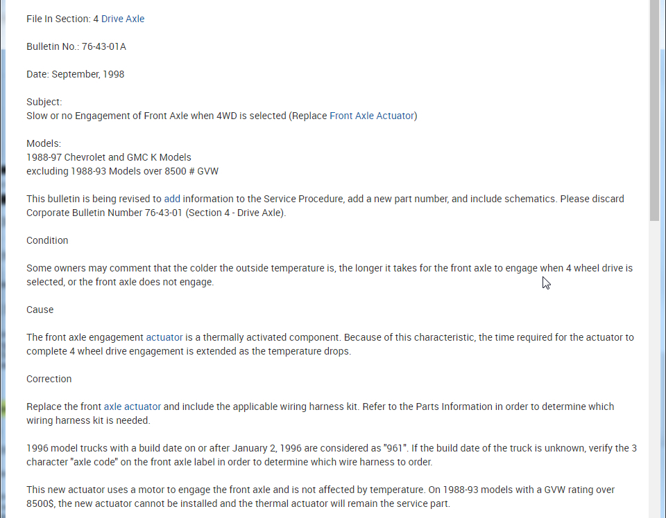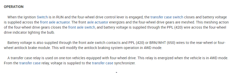 Truck listed above is a K1500 model. When i try to shift into 4h as the book says the front drive train lights on floor light up and it went down to 4h smooth but it doesn't transfer power to front axle. i have tried it at about 10 MPH then a crawl and then i stopped and tried it and it just won't work. So with it in 4h i had my wife let it roll and i watched the CV axles and front driveshaft and they were spinning like they should but it didn't transfer engine power to the front wheels. please help!!!